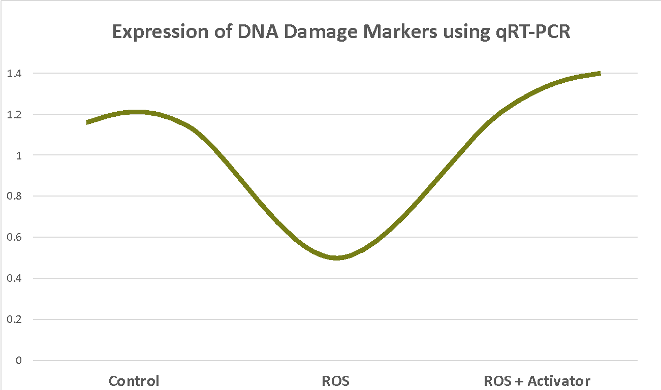 Figure 2b: Representative graph showing pattern of changes in mRNA expression for DNA damage marker genes using qRT-PCR in Primary human RPE cells subject to ROS and then treated with our activator. We see an increase in DNA damage response pathway markers suggesting an upregulation of these pathways to repair the damage caused by ROS.
