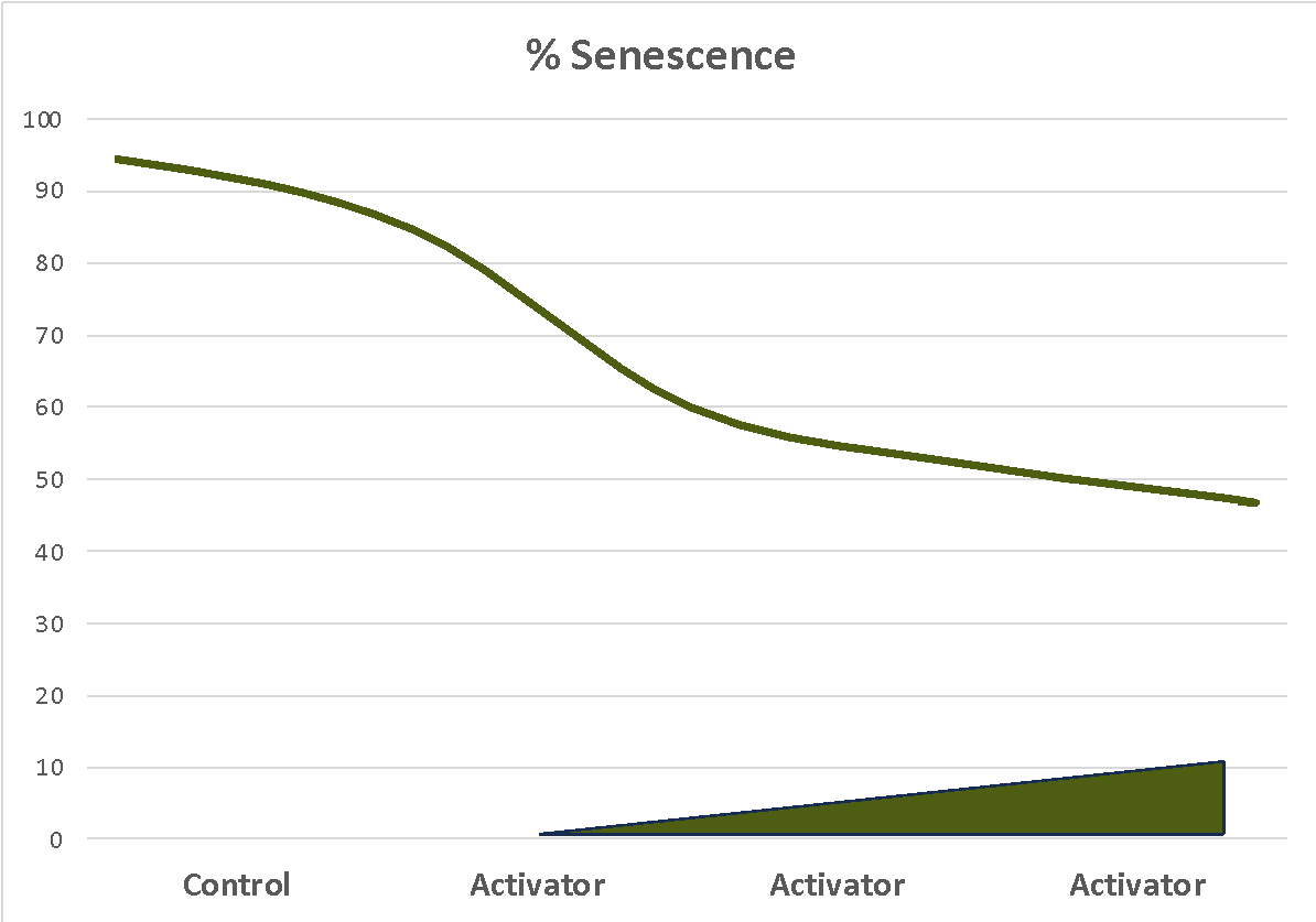 Figure 2a: Reversal of Age-Induced Senescence, (b) Reversal of Age-Induced DNA Damage Response Pathways. Primary human RPE cells were subject to oxidative and replicative stress to senescence and senescent cells were quantified using β-galactosidase assay. We observed that treatment with our activator reversed oxidative stress-induced senescence in a dose-dependent manner.