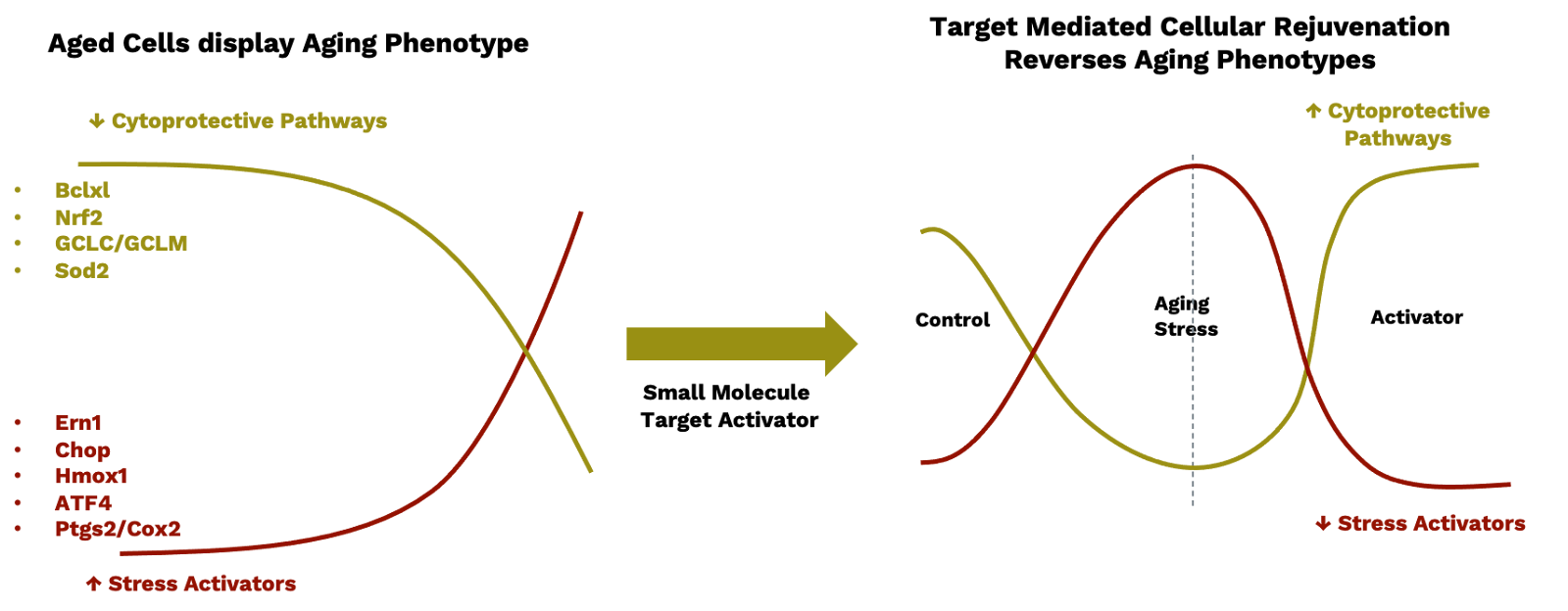 Aging phenotypes exhibit chronic activation of stress pathways, including up-regulation of inflammatory, ER stress and DNA damage, and downregulation of cytoprotective proteins, including pro-survival and antioxidant pathways. Target-mediated cellular reprogramming both upregulates cytoprotective proteins (pro-survival, antioxidant, DNA damage response, mitochondrial lifecycle, and autophagic pathways), and downregulates chronic stress pathways.